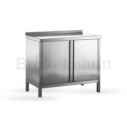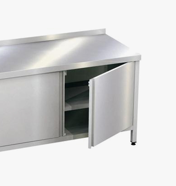 Made of stainless steel AISI304, adjustable legs’ and middle shelf’s height, welded construction, enclosed back, higned door, raised edge – 50 mm.