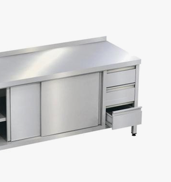 Made of stainless steel AISI304, adjustable legs’ and middle shelf’s height, welded construction, enclosed back, chest of drawers on the left, sliding door, raised edge – 50 mm.