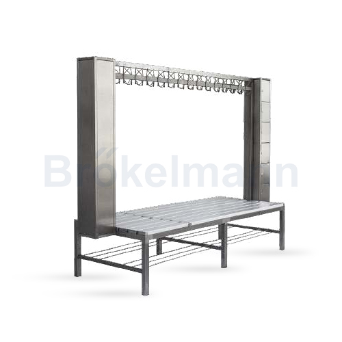 AISI 304, adjustable plastic feet,slanted roof, white plastic board seat, shelf for shoes, clothes’ hangers, compartments lock with key.