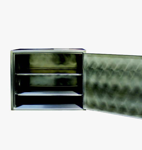 Made of stainless steel AISI 304, lock with key, 2 shelves inside.