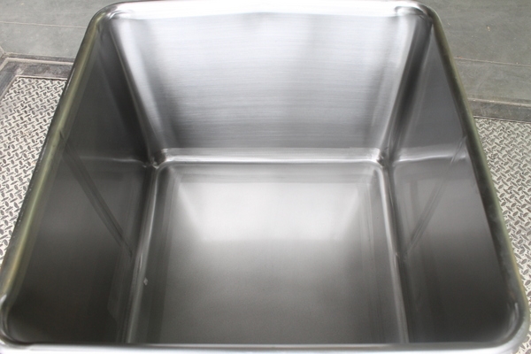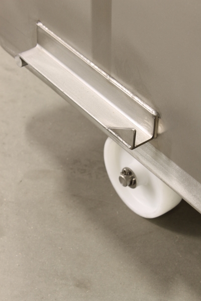 Made of stainless steel AISI 304, 2 mm thick sides, 5 mm thick bottom, 2 slides, 4 tillting wheels, reinforced corners of upper edge rim, trolley 200 L is tared – 40 kg +/- 250 g.