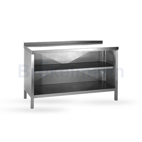 Made of stainless steel AISI304, adjustable legs’ and middle shelf’s height, welded construction, enclosed back, raised edge – 50 mm.