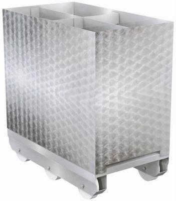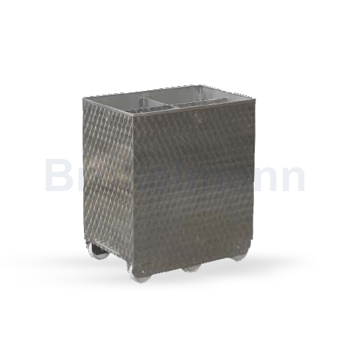 Made of stainless steel AISI 304, grained surface, upright transporting, closed construction, with outflow, for 200 pcs of smoking sticks, 6 tillting wheels.