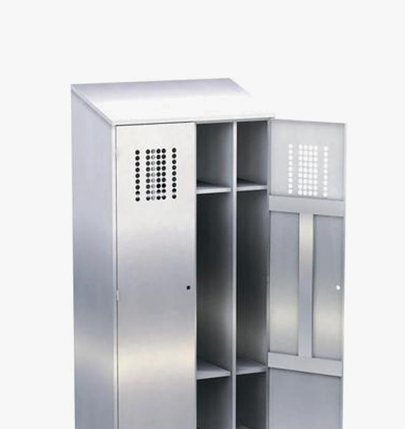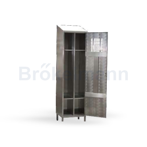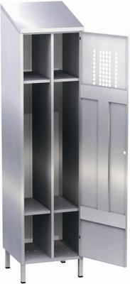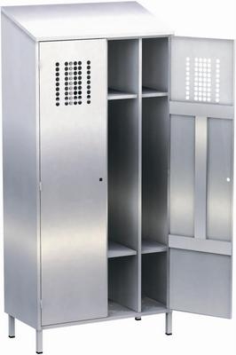 AISI 304, adjustable plastic feet, slanted roof, 2 shelves, clothing bar, door and bottom perforation.
