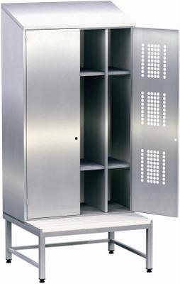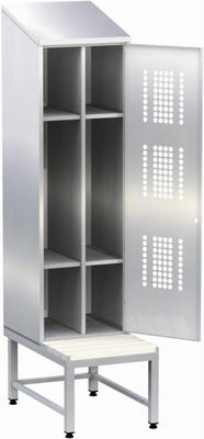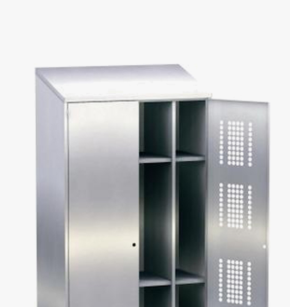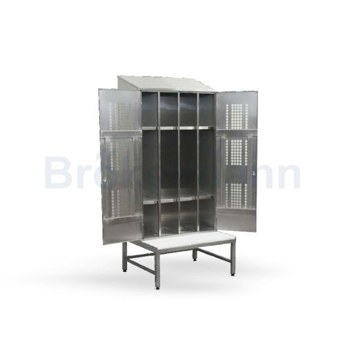 AISI 304, adjustable plastic feet, slanted roof, 2 shelves, clothing bar, door and bottom perforation.